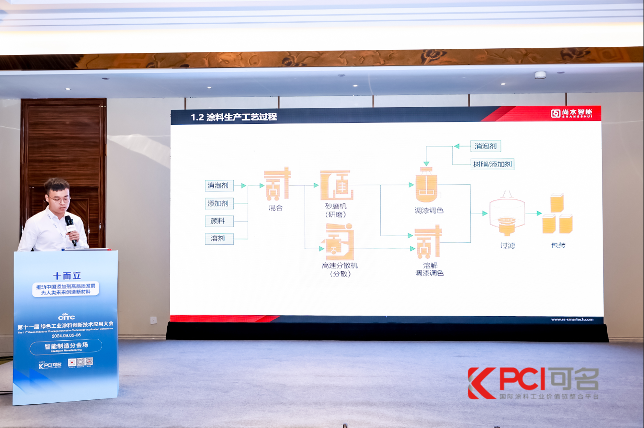 在9月6日的智能制造会场上,尚水智能资深工艺开发工程师邓浩元受邀出席并发表“新型高效分散技术与装备在涂料领域的创新应用”主题演讲,分享了在全球涂料市场规模稳定增长的背景下,分散技术在涂料生产工艺的创新与无限可能。