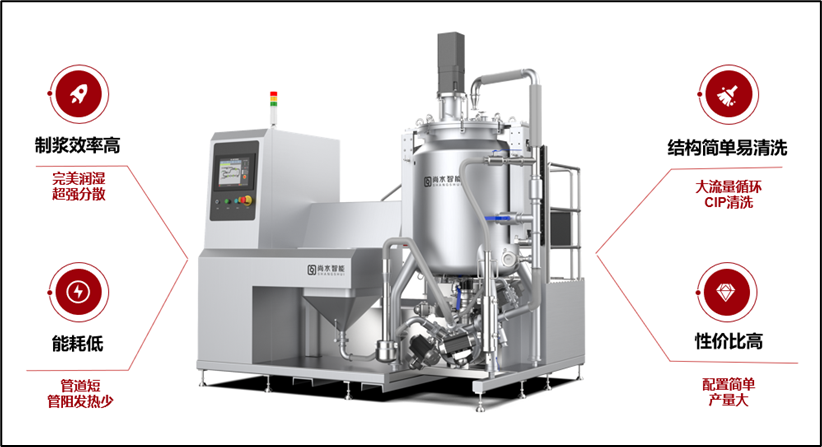 尚水智能针对不同分散阶段,已成功开发多系列分散设备,有效地解决了部分工艺难题。在分散过程中,尚水智能研发的循环分散机等液体分散类设备,加强了分散强度;循环制浆机、COMODO制浆机等固液混合类设备,改善了润湿及分散过程;砂磨机类设备能够研磨更加精细的颗粒;组合式分散技术则通过工艺优化、设备组合等提高了分散效率和性能。