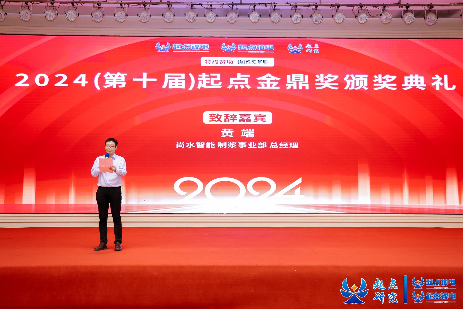 7日晚,尚水智能制浆事业部总经理黄端受邀为第十届起点金鼎奖颁奖并致辞。黄端总经理向各位获奖企业表示祝贺并指出,在全球能源结构转型的大背景下,持续推动技术创新并具备敏锐的市场洞察力,是新能源企业深入了解市场、穿越行业周期、实现共同发展的关键。
