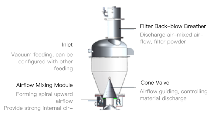 High-pressure, high-speed airflow is emitted from the nozzle, expanding and decompressing as the compressed gas rises. The central powder is continuously “lifted” by the thrust of the flow rate and the “lifting force” generated by gas expansion, then falls to the bottom along the wall due to gravity and air pressure difference. The airflow “lifts” the powder again, creating a rapid circulation mixing process. High-speed airflow also induces relative motion between powders, enhancing the mixing effect.