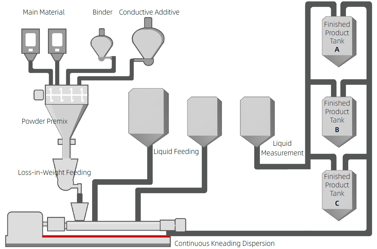 The main equipment consists of a twin-screw extruder and an online disperser, enabling continuous slurry mixing. The continuous kneading disperser, compared to traditional batch slurry mixing methods, allows for entirely continuous, large-scale slurry mixing with a maximum capacity of up to 3,000-5,000L/h. By combining the advantages of high-viscosity kneading with a screw extruder and the high-shear benefits of an online disperser, this system further improves slurry efficiency, consistency, and reduces one-time investment and operational costs of the line as a whole.