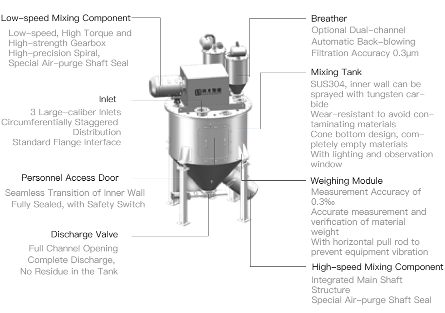 Powder materials rise along the tank’s inner wall under the spiral impeller’s action, reaching a certain height before descending at the tank’s center, achieving a uniformly mixed macro effect. With optional side-arm high-speed mixing impellers, the high-speed paddle drives the surrounding materials, leading to the generation of speed among between the materials, enhancing shear mixing effect, and achieving uniform mixing in a short time.