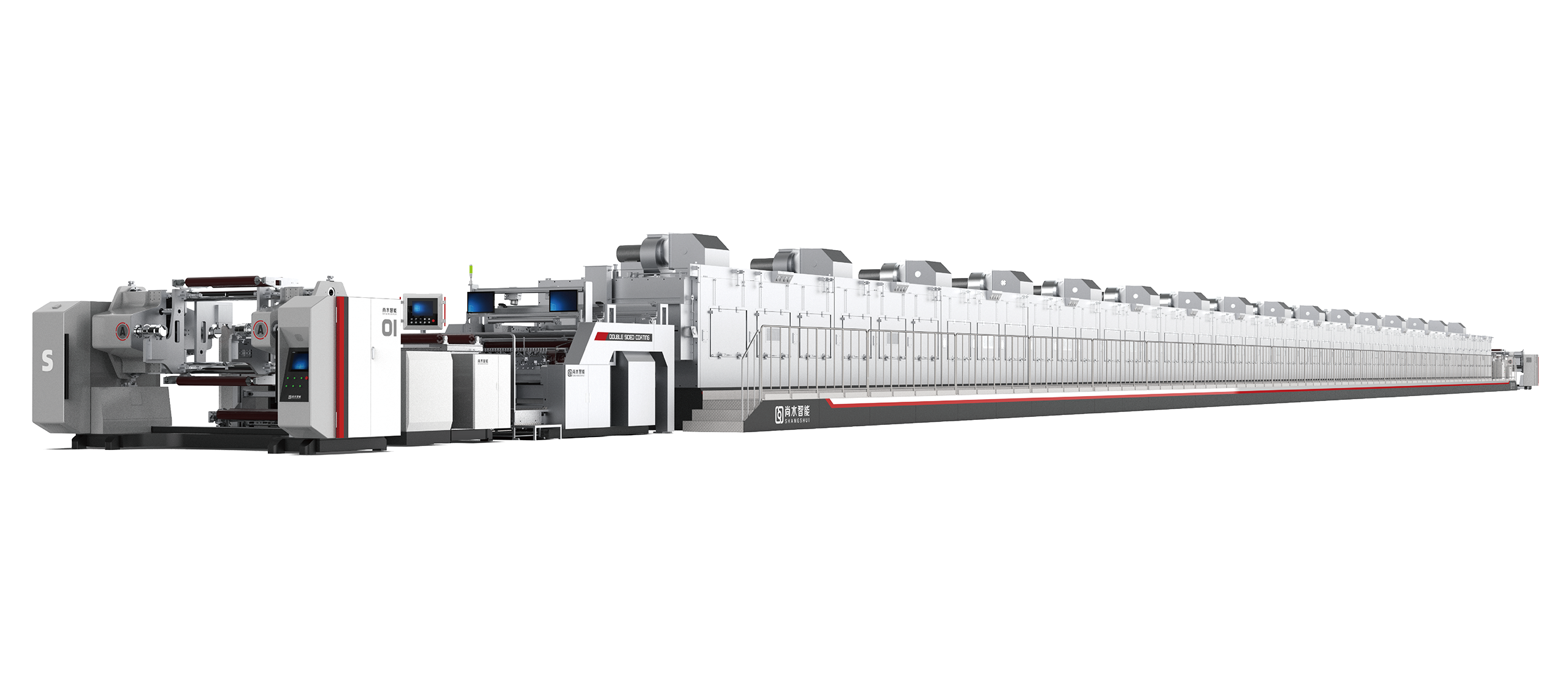 尚水智能双面同时挤压涂布系统主要用于电池正负极浆料在铜铝箔材两面的同时涂布,采用高精度预计量控制及狭缝模头技术,具备精度高、效率高、能耗低、产能大、智能化水平高等特点。