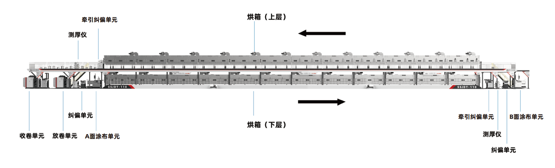 主要用于电池正负极浆料在铜铝箔材两面的单/双面涂布,采用折返路径设计与高精度预计量控制,具备结构紧凑、效率高、精度高等特点。
