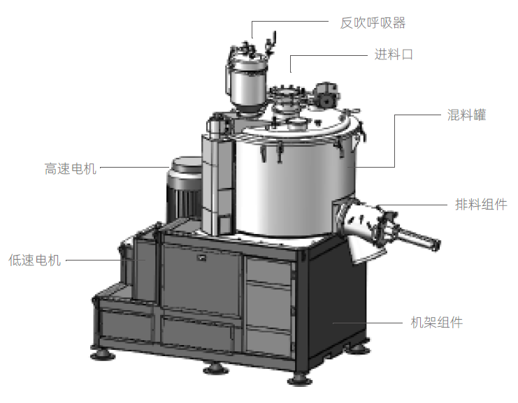 物料在上升下落过程中,因低速桨叶和高速桨叶旋向相反,速度不一,使之产生强烈的对流混合。同时,由于桨叶的搅动,使物料之间产生速度差,加强了剪切混合的效果,使物料在短时间内混合分散均匀。